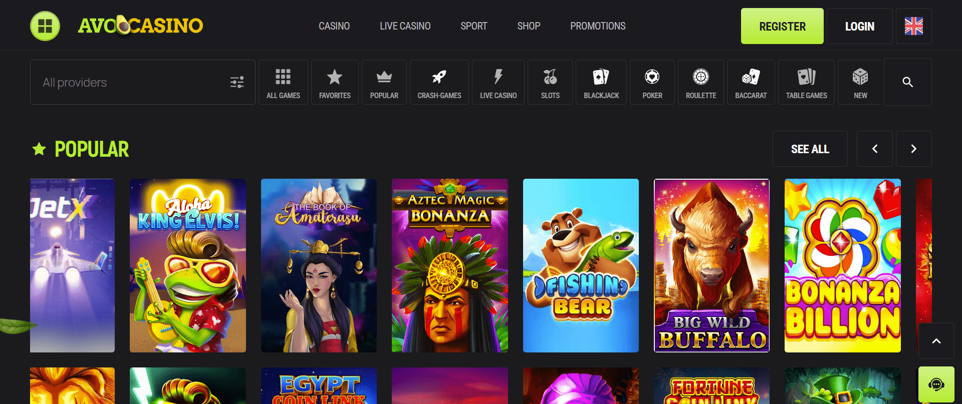 Im Avocasino Casino finden Sie eine Menge einzigartiger und klassischer Casinospiele. Das Casino bietet alle traditionellen Kategorien wie Spielautomaten, Tischspiele und Live-Dealer-Spiele. Diese Kategorien sind definitiv einen Blick wert. Das Casino bietet Tausende von Spielen von Top-Entwicklungsstudios und sorgt so für ein qualitativ hochwertiges Online-Spielerlebnis.