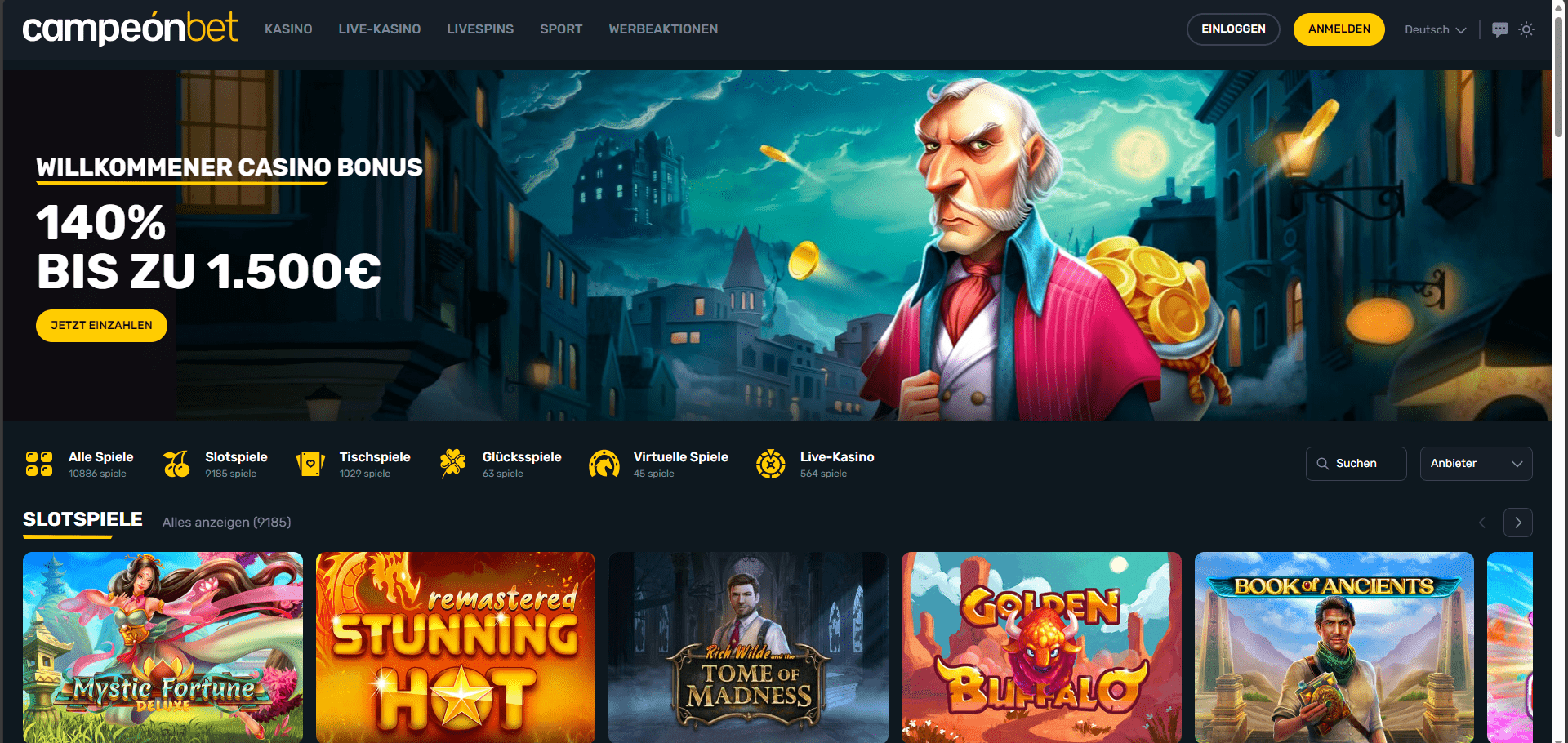 Das Online-Casino Campeonbet wurde 2017 gegründet. Im Laufe der Jahre hat sich das Casino zu einer bekannten Marke entwickelt, die mehrere Auszeichnungen erhielt und jedes Jahr weitere Casinospiele und Sportwetten zu seinem Angebot hinzufügte. Zusätzlich zu 35.000 Live-Sportereignissen bietet der Online-Casino-Service über 5000 Live-Casinospiele von über 25 Top-Softwareanbietern. Es handelt sich um den zuverlässigsten Casino-Betreiber, der von einem der sichersten in Curaca registrierten Unternehmen, CW Marketing B.V., betrieben wird.