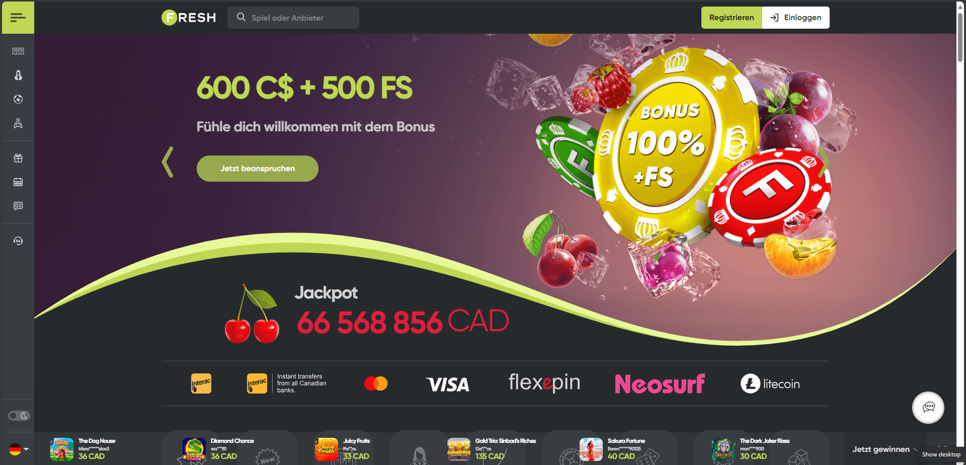 FreshCasino bietet Ihnen drei verschiedene Willkommensbonusangebote zur Auswahl. Das erste ist ein 100 %iger Einzahlungsbonus plus 200 Freispiele mit einer Mindesteinzahlung von 200 €. Das zweite ist ein 150 %-Match mit 100 Freispielen und einer Mindesteinzahlung von 30 €. Das dritte Angebot schließlich umfasst einen Einzahlungszuschlag von 200 % und 75 Freispiele bei einem Mindesteinzahlungsbetrag von 20 €. Weitere Informationen zu den Angeboten des Casinos finden Sie in unserer vollständigen Bewertung der Website.