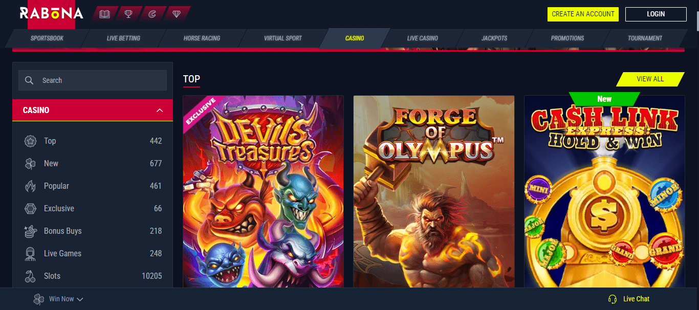 Rabona Casino bietet Spielern mehr als 200 Live-Casinospiele. Sie können klassische Tischspiele wie Poker, Blackjack, Baccarat und Roulette sowie Live-Spielshows von Evolution Gaming und Pragmatic Play spielen.