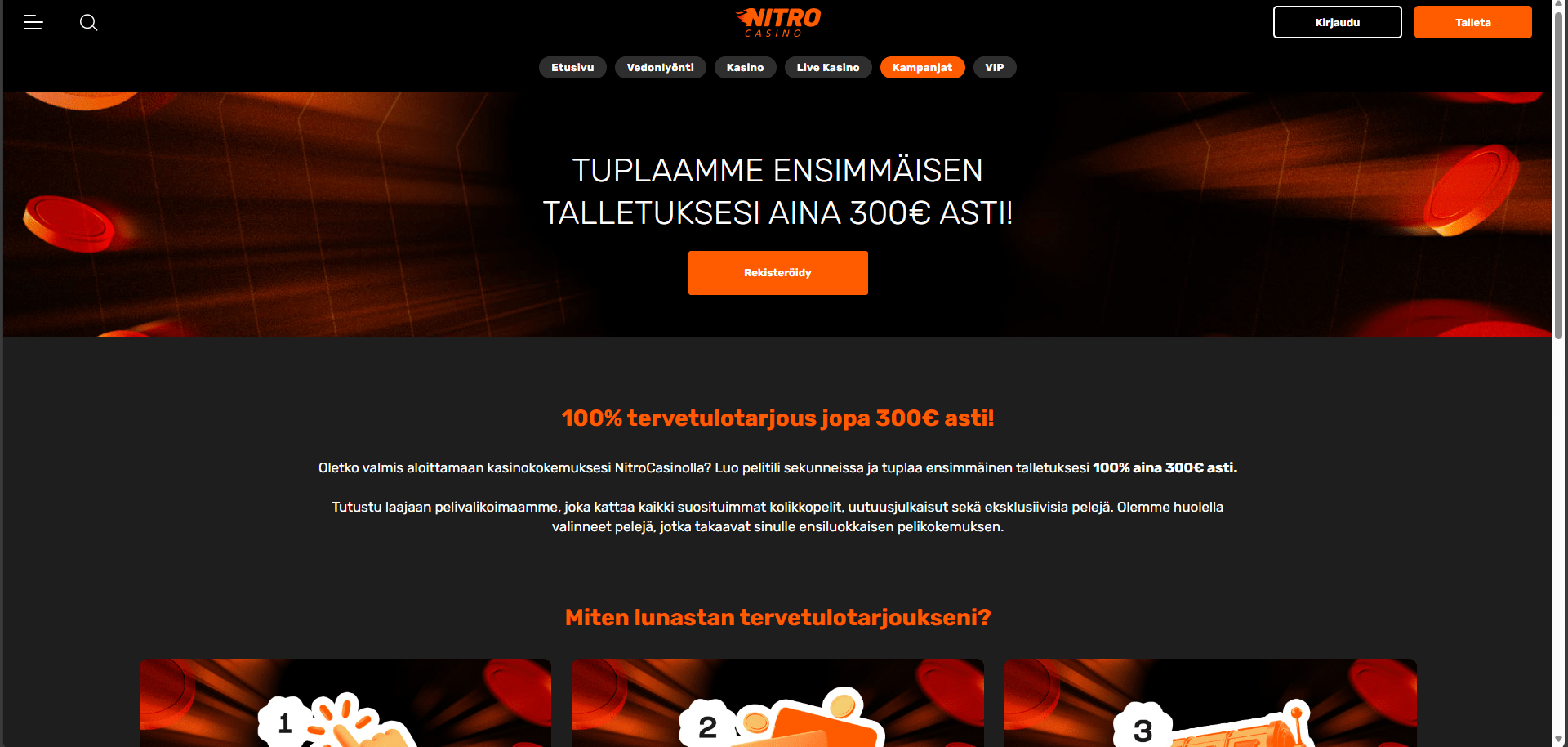 Nitro Casino on Betpoint Group Ltd:n ylläpitämä online-kasino, jossa on satoja pelejä, jotka sisältävät videokolikkopelejä, pöytäpelejä ja heillä on livekasino. Pelaajat voivat nauttia useista ohjelmistotoimittajista, joita ovat NetEnt, Play’n GO, Quickspin, Pragmatic Play, Red Tiger Gaming, NoLimit City ja monet muut. Sivusto tukee useita kieliä, ja sitä voidaan pelata heti tai liikkeellä ollessasi. Nitro Casino on Maltan peliviranomaisen lisensoima ja sääntelemä.